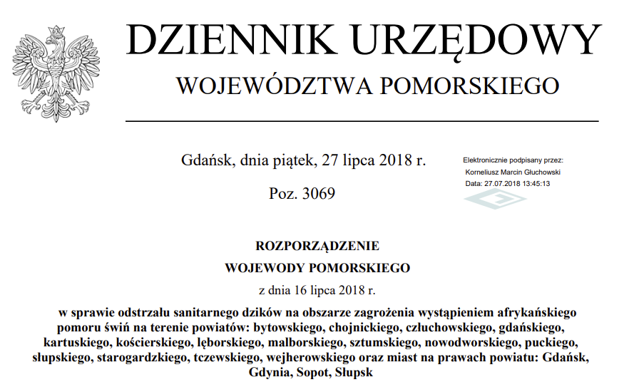 Rozporządzenie Wojewody Pomorskiego z dnia 16 lipca 2018 r. w sprawie odstrzału sanitarnego dzików na obszarze zagrożenia wystąpieniem afrykańskiego pomoru świń na terenie powiatów: bytowskiego, chojnickiego, człuchowskiego, gdańskiego, kartuskiego, kościerskiego, lęborskiego, malborskiego, sztumskiego, nowodworskiego, puckiego, słupskiego, starogardzkiego, tczewskiego, wejherowskiego oraz miast na prawach powiatu: Gdańsk, Gdynia, Sopot, Słupsk